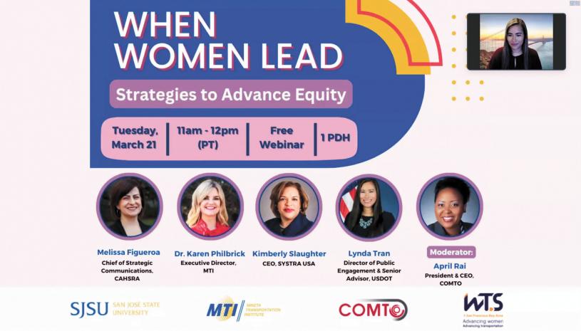 為了慶祝女性歷史月,聖荷西州立大學(SJSU)峰田交通研究所(MTI)和少數族裔交通官員周二上午舉行了一場網絡研討會,主題為「當女性領導:促進平等的戰略」。