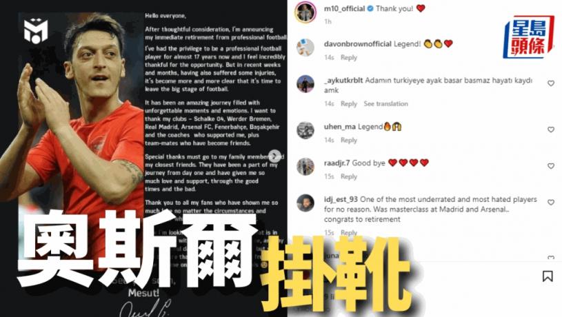 2014世界盃德國冠軍隊成員奧斯爾,曾經效力皇家馬德里和阿仙奴等歐洲豪門,贏過西班牙甲組足球聯賽和英格蘭足總盃。2018俄羅斯世界盃後,奧斯爾被指與出生地土耳其總統埃爾多安關係密切,質疑其對德國的忠誠,他因而退出德國國家隊。去年夏天加盟巴沙克舒希後一直受背傷困擾,周三於個人社交媒體公布退役的消息,他說:「經過深思熟慮認為是時候要退役,很高興經歷精彩的17年職業球員生涯,感謝所有曾經給我機會的人。」