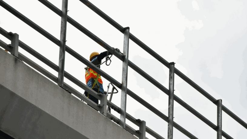 西九龍法院外行車天橋欄杆處,有工人正加裝防護網。盧江球攝