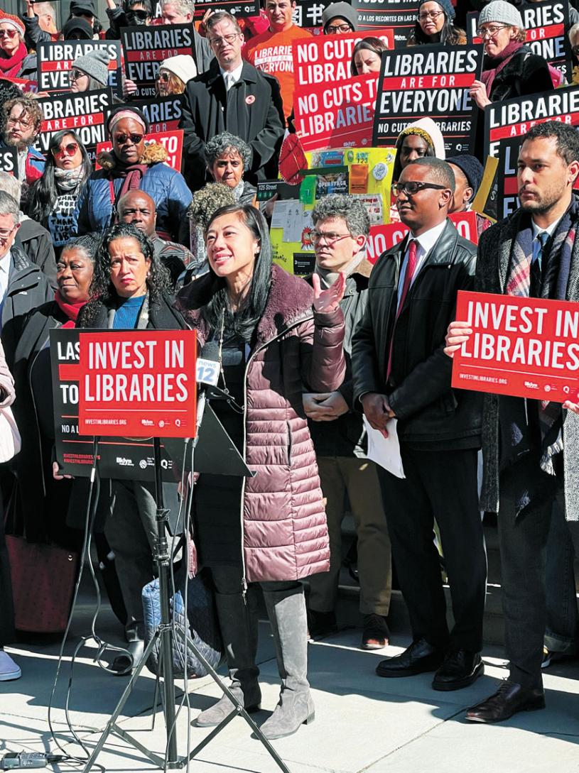 市議員黃敏儀表示,圖書館為各個種族、年齡和經濟階層的人服務,對圖書館的投資回報是不可估量的。然而,要求圖書館,在本就僅接受市預算一小部分資助的基礎上,考慮接受破壞性的預算削減——要求他們用更少的錢做到事半功倍,這是不合情理的。黃敏儀承諾將努力確保城市的圖書館擁有繼續為我們的社區提供重要項目和服務所需的資金。她在聽證會前與市議會成員以及圖書館領導、工作人員、工會盟友和支持者在市政廳前集會,譴責削減圖書館預算的提議。本報記者高彥然紐約報道