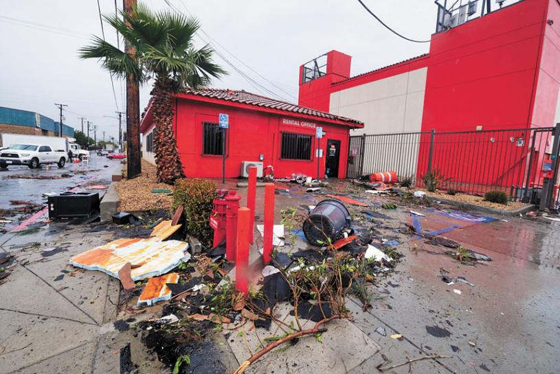 另一場龍捲風隔日則襲擊洛杉磯東南部的蒙地貝婁市,將一排商業建築屋頂吹走,碎片被捲入空中。