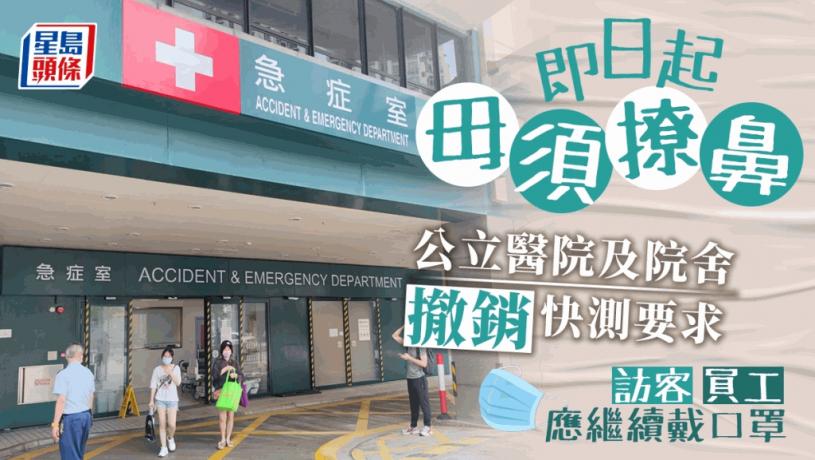 因應疫情持續緩和,港府由今日(25日)起撤銷公立醫院及安老院和殘疾人士院舍的快測要求。探訪人士探訪前毋須做快測,員工及住客亦毋須撩鼻每日進行快測。但為繼續保護重點人群,減低病毒傳播風險,市民進入上述場所時應戴上口罩,如有不適,不應前往探訪,並請盡快求醫。