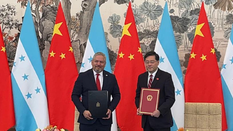 新華社報道,中國由今(26日)與洪都拉斯建立外交關係。央視報道,國務委員兼外交部長秦剛在北京與洪都拉斯外交部長雷納舉行會談,並簽署了《中華人民共和國和洪都拉斯共和國關於建立外交關係的聯合公報》。