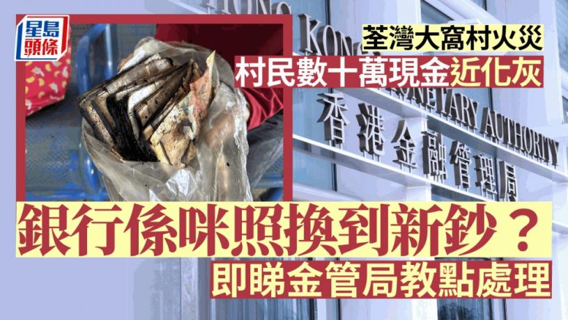 荃灣芙蓉山大窩村昨晚(26日)二級火,多間寮屋被焚毀,有村民家中數十萬現金積蓄被燒至溶溶爛爛,部分甚至化成灰燼。就被燒毀現金應如何更換,金管局回覆查詢時表示,市民可向有關發鈔銀行要求兌換殘損鈔票。銀行會根據既定的準則來驗證殘損鈔票,例如損毀程度、防偽特徵是否完整,以決定可否兌回原值。由於每張鈔票的損毀情況會有不同,銀行會個別考慮。