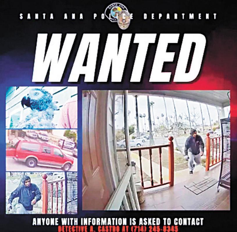 聖安娜警方稍早前公布一段視頻,請求公眾幫助確認兩名男子的身份,這兩名男子涉嫌在本月早些時候,從一戶人家的門廊上,偷走一個裝有非洲灰鸚鵡的鳥籠,而盜賊自以為天衣無縫的行動,全部被拍進了屋主安裝的攝影機裡