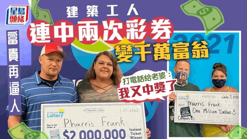 現年41歲的法蘭克(Pharris Frank)原本是一名普通的建築工人,2021年7月才贏得美元100萬元(785萬港元)大獎,當時用這筆獎金與妻子一起舉辦夢幻婚禮。沒想到好運再度臨門,近期他又再去購買彩券,結果再度中獎,而且獎金是上次的兩倍,是200萬美元(約1570萬港元)大獎。
