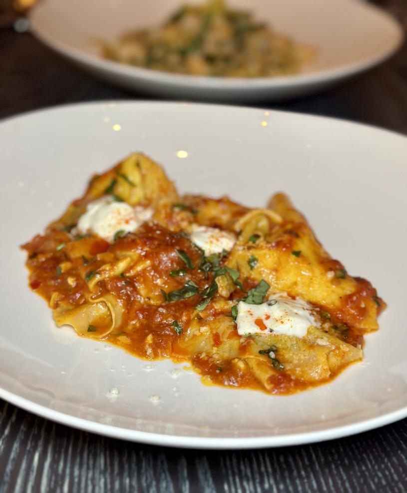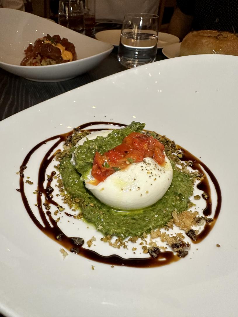 一份布拉達芝士配綠醬吃得我如癡如醉。布拉達芝士輕輕一切開,