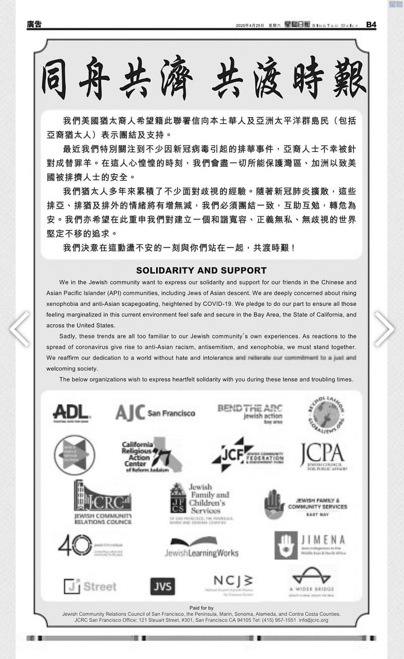 三藩市灣區本地KTVU電視台日前報道一則新聞,題為:「灣區猶太裔與亞裔的友誼起源於一則報紙廣告」。文中講述三藩市猶太裔社區關係議會(Jewish Community Relations Council)2020年疫情初在星島日報美西版刊登支持反仇視亞裔運動的廣告後,出乎意料獲得很多華人和組織的邀請。如今該機構已與三藩市亞太議會(API Council)建立長期互動,共同推動反仇恨犯罪。