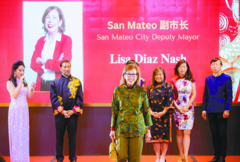 晚會亮點環節“社區明星華服秀”,參加走秀的模特是灣區各城市的現任市長和議員,舞台上他們展現了政界領導者們時尚動人的一面,場面熱烈,頗接地氣。自去年旗袍文化月上,“社區明星華服秀”欄目首度亮相以來。今年更增添了男士面孔,Daly City市長Raymond Buenaventura 、Fremont市議員邵陽,在旗袍文化月主舞臺上與民同樂。參加走秀,並興奮的表示,作為公眾人物,形象是我們遞出的第一張名片,每個人都有追求美好和成為美好的權利。San Mateo 副市長Lisa身著中國非物質文化遺產香雲紗面料,手工制作的中式上衣,圖案是北宋畫家王希孟的名畫《千\xf9埵縣s圖》,搭配同款圖案的中式手包,為中國傳統文化傾情代言,成為晚會焦點。