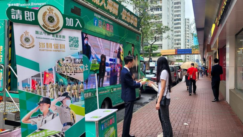 海關表示近日已有很多市民參觀宣傳車及報名投考。而招聘宣傳車車內除設有部門資訊、部門不同工作範疇的介紹影片以及體能測驗示範影片外,亦有遴選程序準備貼士影片及過往試題,更有小測驗讓參觀者小試牛刀。車內亦設有即場投考櫃台,供有興趣人士即場報名,即場報名更可獲贈小禮物。