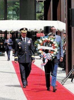 芝加哥市長布蘭登約翰遜(右)獻上花環緬懷隕落的無名英雄。 梁敏育攝