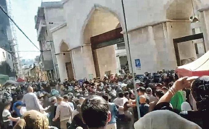 據網傳影片顯示,大批武警持盾與民眾對峙,示威人群企圖衝入清真寺被攔下,有人向警員拋水瓶,其後一群穿着迷彩色軍服的人抵達現場,引起大量民眾圍觀。另有影片顯示,武警暫時撤離後,示威人群進入清真寺並拉倒鐵架。