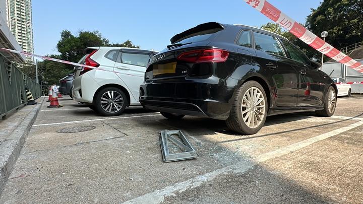 鋁窗從天而降,私家車損毀。劉漢權攝