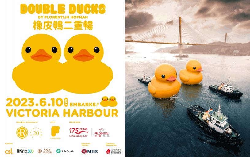 荷蘭藝術家霍夫曼(Florentijn Hofman)創作的巨型橡皮鴨,自 2007 年起遨「游」世界各地,2013 年的《橡皮鴨游世界.香港站》由創意品牌 AllRightsReserved(ARR)策展,吸引大批市民旅客蜂擁親臨維港海濱一睹真身,今年適逢橡皮鴨訪港 10 周年,ARR 特別主辦大型海上公共藝術展覽《橡皮鴨二重暢》,橡皮鴨首度偕同伴雙雙暢遊維多利亞港,於 6 月 10 日起開放予公眾,展期視乎天氣等情況而定,預計為期約兩星期。橡皮鴨停駐在維港海面,毗鄰添馬公園及中西區海濱長廊(中環段),為 10周年里程碑錦上添花,見證這次極具紀念值的歷史時刻,約定與市民旅客共聚美好時光。展覽獲全城熱烈支持,包括支持機構香港旅遊發展局及主力贊助保誠保險。其他贊助包括 csl.、昂坪 360、意博金融、ZA Bank,及合作夥伴港鐵公司。