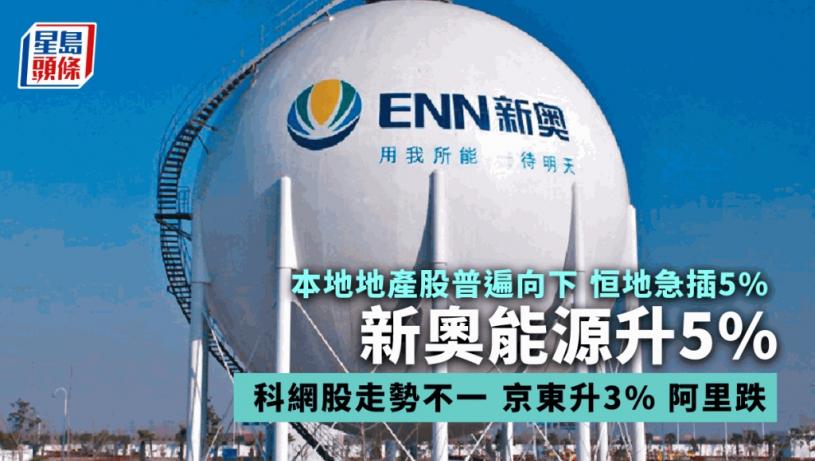 能源股逆市造好,券商引述燃氣股新奧能源(2688)稱已開始向住宅用戶轉嫁成本,新奧能源大漲4.9%收報95.5元,為升幅最大藍籌;同業中燃氣(384)彈4.6%收報9.29元;潤燃(1193)升2.9%收報26.5元。