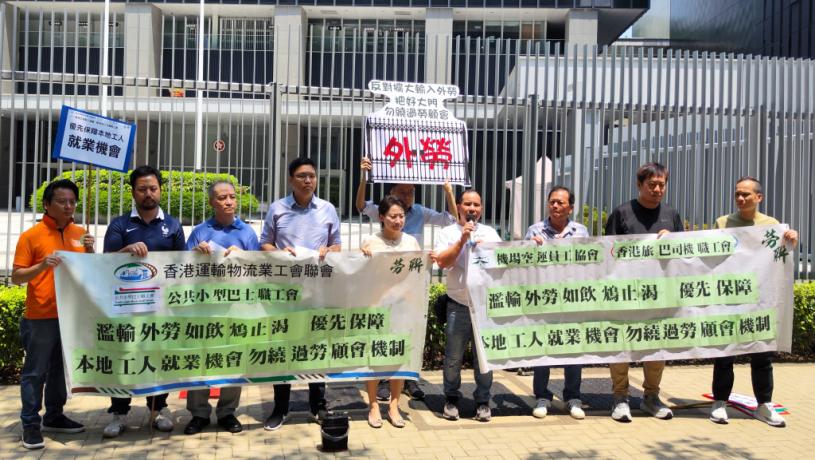 早前有消息指政府計劃就運輸業擴大輸入外勞,不少運輸業前線工友向工會反映指,憂慮大量輸入外勞將會嚴重打擊本地基層工人的就業機會。香港運輸物流業工會聯會,公共小型巴士職工會、機場空運員工協會及香港旅巴司機職工會今日(2日)聯同行業工友發起反對擴大輸入外勞請願行動,向政府當局遞交請願信並提出訴求。