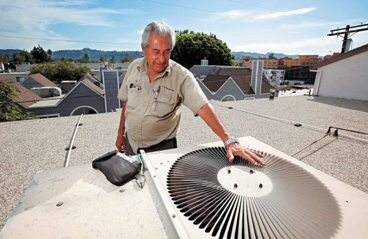 「A&M Refrigeration Co.」創始人Al Manzano在北荷里活一棟公寓樓屋頂檢查空調。美聯社