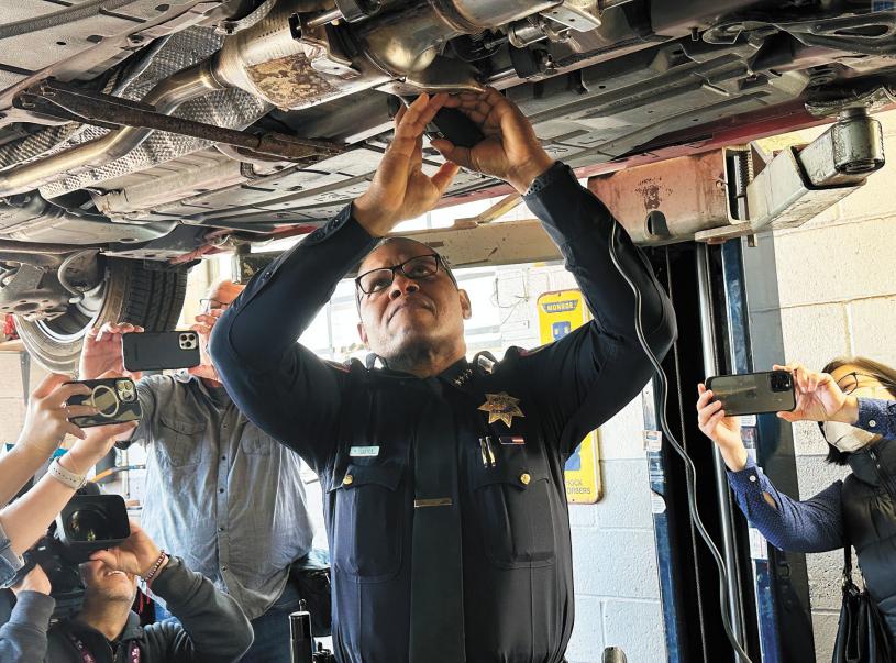 日落區市參事殷嘉立(Joel Engardio)近日宣布與三藩市警察局以及當地企業合作,為三藩市居民提供免費的汽車催化轉換器蝕刻計劃,希望有助防範催化轉換器被盜。該計劃於周五上午10時在日落區Sunset Auto Care正式啟動,殷嘉立及警察局長施革(Bill Scott)均到場並親自上陣為居民的車輛進行蝕刻和噴漆。