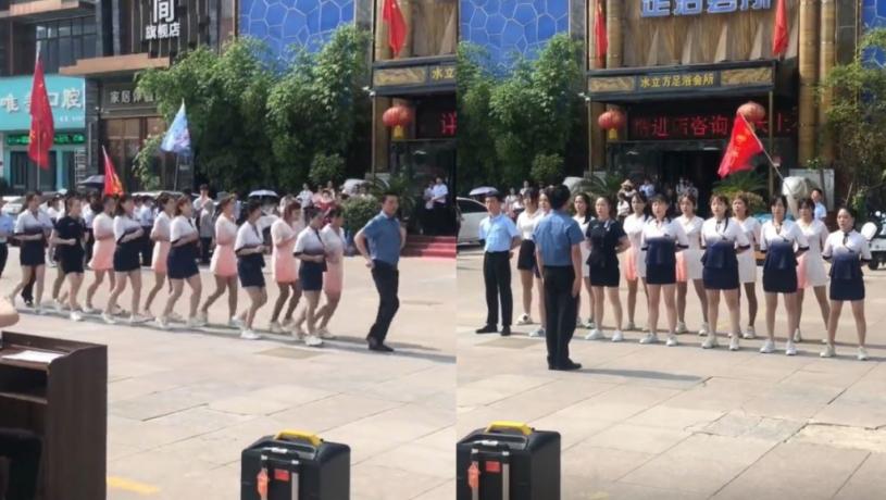 影片所見,內地一間名叫「水立方足浴會所」店外空地,一班為數約十多名,身穿制服的女子,跟着一名領班在空地上步操,而遠處亦有其他疑似同事在等候。各人在上司前整齊站立,上司隨後亦「回禮示意」。由於影片用快鏡播攝,故未能清楚聽到技師們所叫的口號。