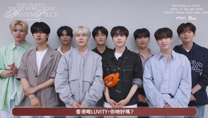 被譽為「怪物新人」的韓國男團CRAVITY,本月起正式展開首個世界巡迴演唱會,9位成員將於7月29日(六)首度襲港在九展舉行「2023 CRAVITY THE 1ST WORLD TOUR ‘MASTERPIECE’ IN HONG KONG」演唱會。