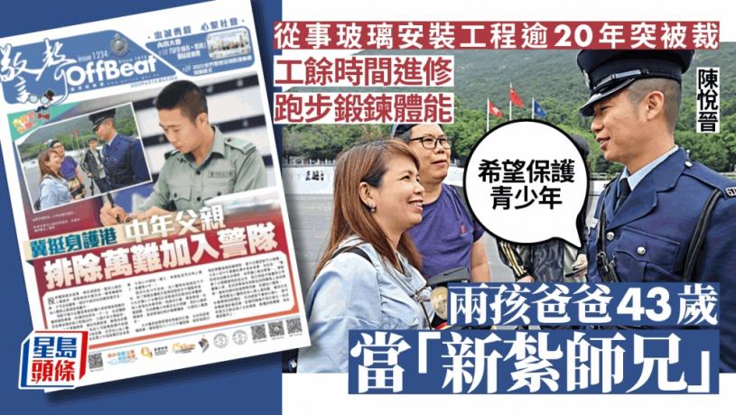 今個月(18日)是父親節,警務處今日出版的《警聲》刊出一位中年「新紮師兄」的訪問。43歲的陳悅晉剛於警察學院畢業,與妻子育有一子一女,投身警隊前從事玻璃安裝工程逾20年,已晉升至主管級別,至2019年黑暴肆虐,加上2020年初他因公司經營困難而被裁員,而令他萌生加入警隊想法,捍衛法治。「當時眼見青少年被誤導而投身黑暴,令我心中燃起一團火,希望挺身而出制止暴力,保護青少年。」