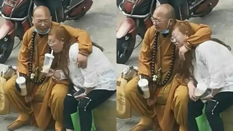 影片顯示,6月5日,江蘇淮安清江浦區金城路街頭,一名戴眼睛、僧人裝扮的男子脫掉口罩,手持奶茶,當街摟抱一女子。畫面中,兩人坐在街邊台階上有說有笑,該女子將頭靠在「和尚」肩膀上,相當甜蜜。