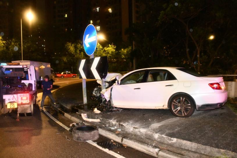 今日(9日)凌晨近一時,一輛豐田Mark X白色私家車沿連翔道往尖沙咀方向前行期間,駛經海輝道迴旋處時疑因天雨路滑,車輛失控鏟上迴旋處石壆並撞到一個提示路牌。現場所見車頭損毀嚴重,可見當時衝力甚猛。