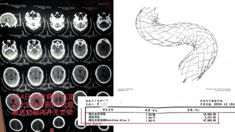 當時醫生告知家屬,如果不予血管內介入治療,患者隨時可能因動脈閉塞導致死亡。經家屬簽字同意,4月6日,齊某再次作為主刀醫生,對朱老翁進行經皮基底動脈支架植入術,術後告知家屬手術成功。手術記錄均顯示,朱老翁安裝了一枚進口Neuroform Atlas 4.5/21支架,病程記錄也多次提到「血管狹窄明顯改善」。朱老翁4月10日「康復」出院,家屬結清了住院醫療費用,合計12萬餘元,部分自費。收據顯示,其中顱內支持導管收費1.88萬,神經導絲4275元,而Neuroform Atlas進口顱內支架為4.7萬元。