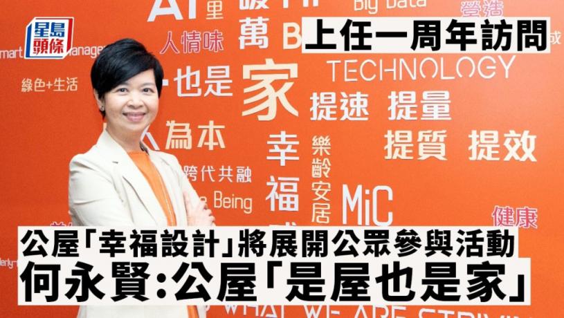 房屋局是今屆新設的政策局,其辦公室多以橙、紅色為主,接待處旁的牆上更暗藏多個房屋署的標誌,據了解這個設計正是出自局長何永賢之手。本身是建築師的何永賢,在訪問當天亦是身穿橙色衣服,她坦言喜歡這個色調,可以帶給人陽光的感覺、有幸福感。她透露,去年《施政報告》提出,要為公屋訂立「幸福設計」指引,最快今個暑假會展開首階段的公眾參與活動,希望將來為居民帶來平凡的幸福。
