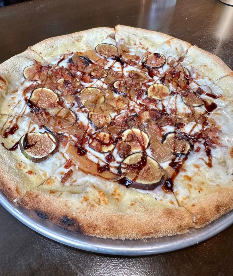 披薩我們也點了一份。薄薄的披薩皮上鋪上芝士,新鮮無花果,
