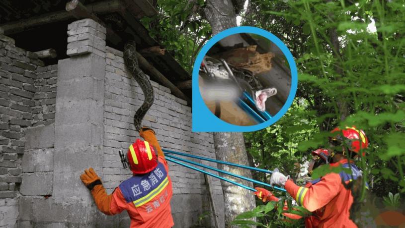 雲南一條村來了不速之客,13.5公斤重的大蟒蛇偷偷入屋,咬死鴨子、吞了一隻雞,還趴在牆上打瞌睡!幾名消防員合作,成功捕獲這條大蟒蛇,並讓牠「獲利回吐」,將偷吃的雞「退還」。
