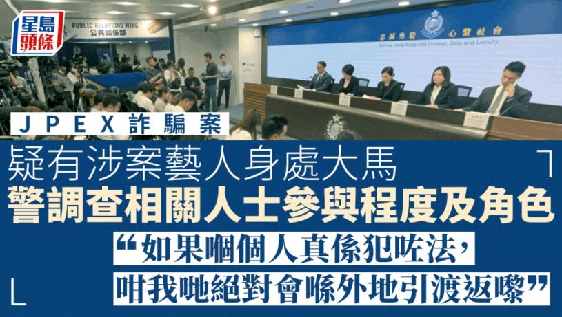 虛擬資產交易平台JPEX遭證監會發聲明指無牌經營,警方其後採取大規模執法行動,先後以涉嫌串謀詐騙拘捕8名男女,包括林作及虛擬資產投資KOL「陳怡」。警方今日(19日)聯同證監會舉行聯合記者會,有記者問到與案件有關的藝人已經前往馬來西亞,是否會將她引渡回港,商業罪案調查科警司李慕賢指警方仍在調查案件,會根據相關人士的參與程度及案件角色採取相應行動,「如果嗰個人真係喺香港犯咗法,咁我哋絕對會喺外地引渡返嚟回港」。
