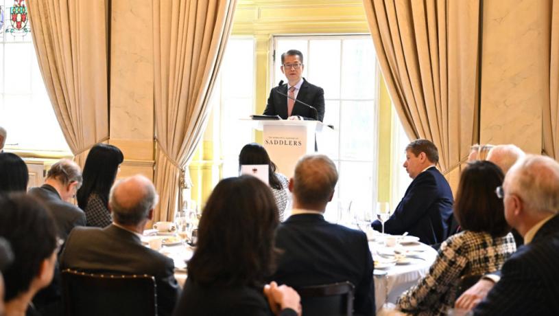 其後,他出席了英國香港工商協會的午餐會,向超過120名英國政商界嘉賓發表演說時表示,國家堅定支持「一國兩制」制度在香港長期實施。在這個制度下,香港獨特的地位和普通法、法治,以及其他優勢長期持續。展望未來,香港正全速推進以金融服務和創新科技雙引擎引領的高質量發展,並決意成為國際綠色科技和綠色金融中心。香港現正大力引進重點企業和人才,歡迎英國企業和商界以及專業界別人才到香港發展。此外,為提升發展容量,落實各項產業發展和改善民生計劃,香港正大力推動發展北部都會區和交椅洲人工島等基建項目,歡迎英國商界和企業到香港尋求合作的機會。