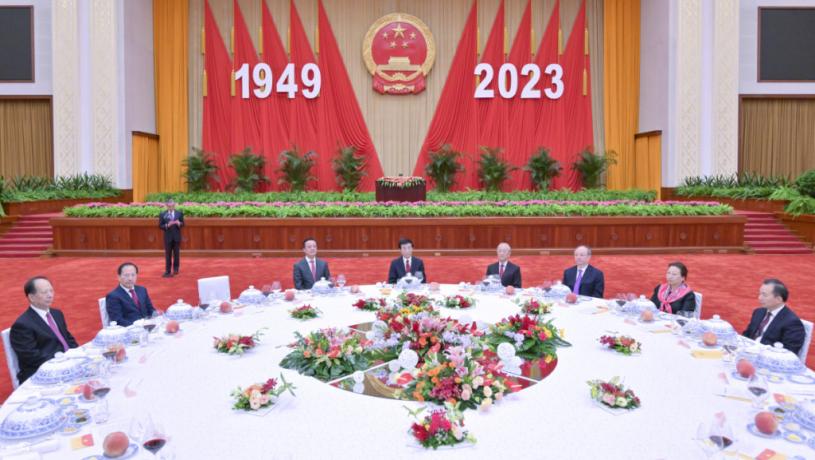 全國政協常委、中國和平統一促進會香港總會會長姚志勝更成為主桌「首賓」,坐在王滬寧與政治局委員、中央外辦主任王毅之間。約1100名港澳台僑各界代表出席,中央港澳辦主任夏寶龍也出現在招待會。