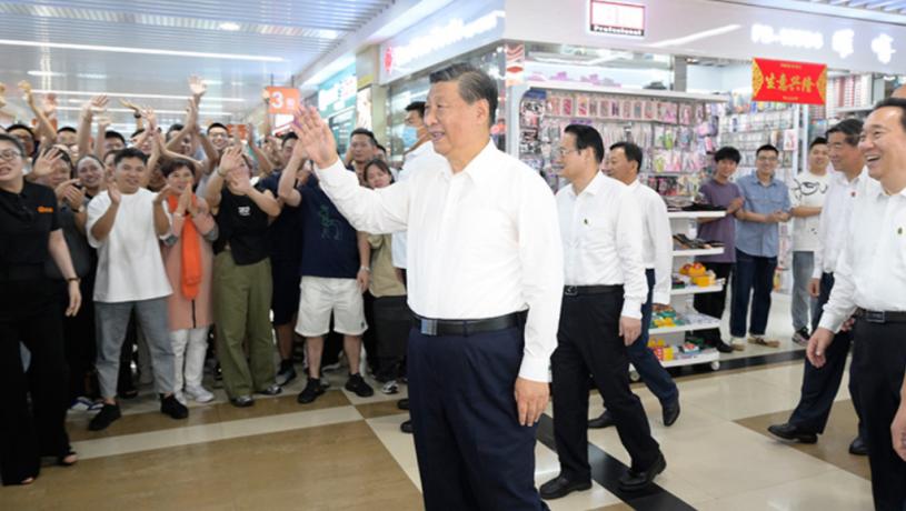 ,習近平在義烏國際商貿城考察時,同商戶、小企業主代表親切交流。新華社