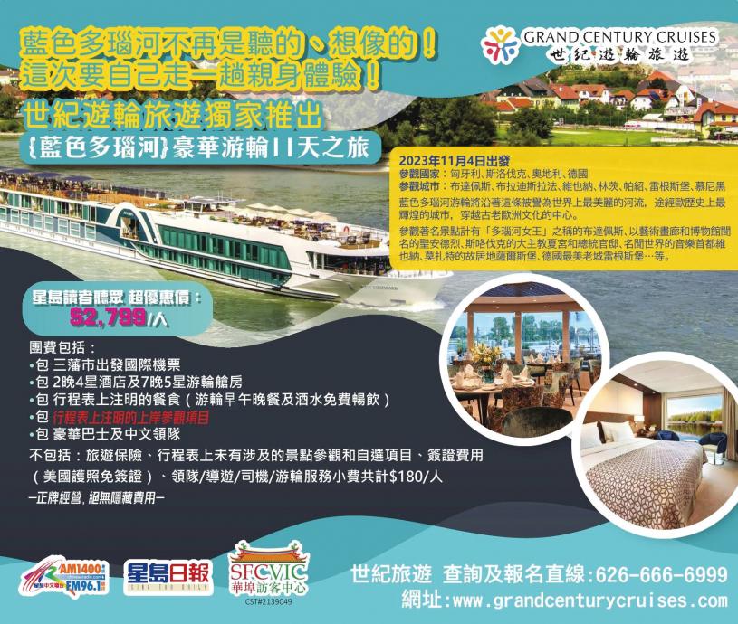 (工商新聞)世紀遊輪旅遊獨家推出{藍色多瑙河}豪華游輪11天之旅2023年11月4日出發。星島中文電台粵語台總監葉麗玲 Cindy Yip 特別隨團。參觀國家:匈牙利、斯洛伐克、奧地利、德國參觀城市:布達佩斯、布拉迪斯拉法、維也納、林茨、帕紹、雷根斯堡、慕尼黑