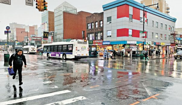 傾盆大雨惡劣天氣,平日人潮如織的法拉盛商業區緬街夾羅斯福大道,一片泠清。