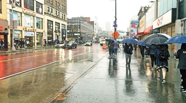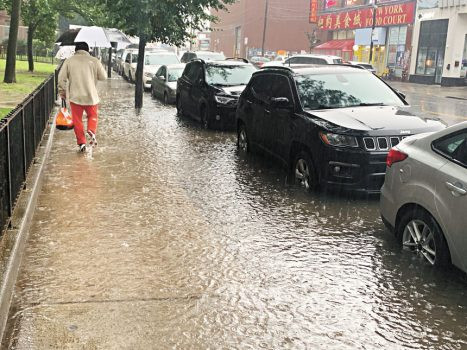 29日早上至中午一段時間,傾盆大雨造成法拉盛商業區街道如澤國,大學點大道至王子街一段羅斯福大道北邊車道與人行道,積水近呎,停在路邊的汽車大半個輪胎泡進水中,行人在水深近半呎的路上涉水而行,不但鞋子全濕,褲子也被雨水濕透,狠狽不堪。