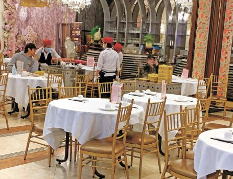 持續逾20小時的大雨,法拉盛餐飲生意受影響,中秋節飲早茶一位難求現象也不復見,酒樓大堂座位大部分都沒有食客。
