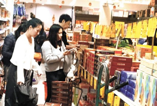 最後衝刺購買應節月餅的消費者,冒著暴風雨的惡劣天氣,在法拉盛的華人超市選購。