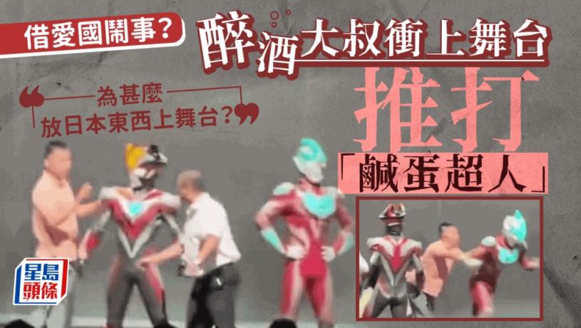 這名大叔憤怒地衝向舞台對著幾個「鹹蛋超人」瘋狂推搡,舞台工作人員拉都拉不住,據了解,這名觀眾認為「鹹蛋超人」是日本文化,看著那幾個「鹹蛋超人」在舞台上與底下觀眾互動,這名男子沒有控制住自己反日的情緒,一瞬間便衝上了舞台對「鹹蛋超人」進行推搡拳打,試圖要將他們趕下舞台,並大聲質問工作人員:「為甚麼放日本的東西上舞台?」
