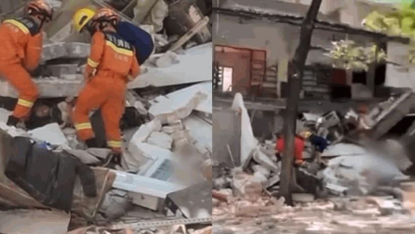 有人被建築碎塊壓住,消防員醫護人員緊張營救。