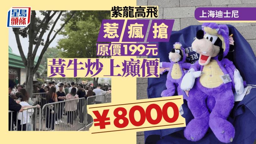 黃牛黨炒賣無處不在。上海迪士尼剛推出新系列毛公仔,其中一款原價199元人民幣(下同)的高飛「紫色的飛龍」,居然上架一個上午便被掃光光,之後被黃牛在網上把價錢炒至8,000元天價,惹來不少網民非議。