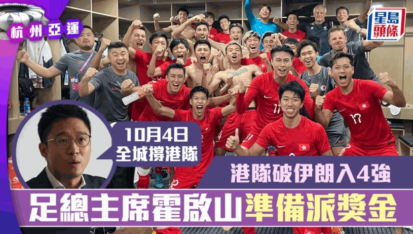 U23港隊今次踢入亞運4強,成就香港代表團在國慶日最驚喜戰果,足總主席霍啟山發表賀電說:「今次歷史性打入亞運4強,我為球隊感到非常驕傲,面對強隊伊朗,每一位球員咬緊牙關、拼盡全力,發揮香港精神,獎金方面一定會有安排。」