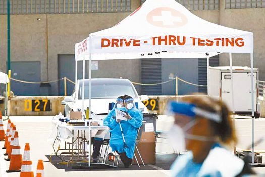 2020年,工作人員在安那罕會議中心分發COVID-19檢測試劑盒。洛杉磯時報