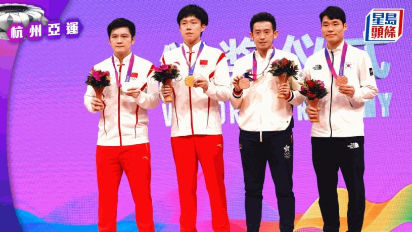 黃鎮廷與團隊合照,他是繼李靜(右)2006年多哈亞運男單銅牌之後,另一位港將贏得亞運單打獎牌。 港協暨奧委會圖片