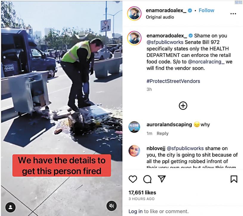 三藩市工務局周一表示,正在調查一起員工將食品攤販的手推車推翻在地一事。