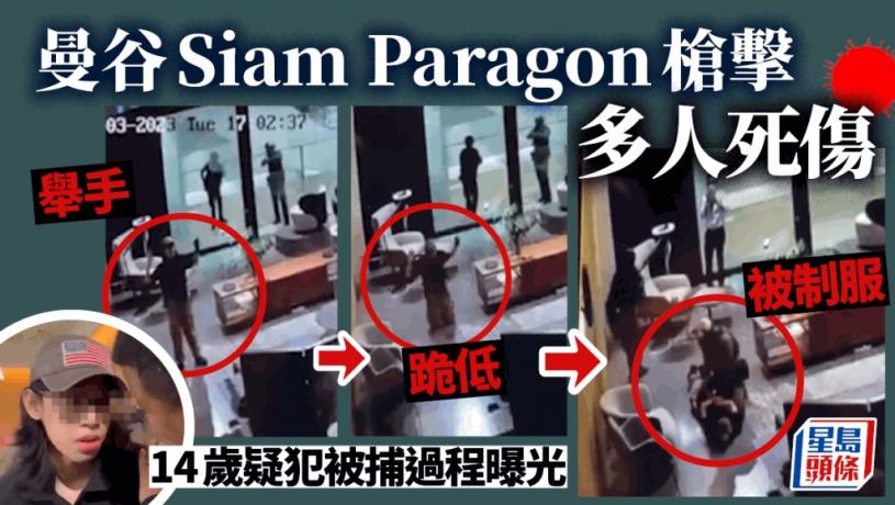 泰國曼谷著名商場Siam Paragon(暹羅百麗宮)今日下午發生槍擊案,至少1死多人受傷,當局曾多次修改傷亡數字。由於現場為著名旅遊區,事件震驚全球。消息指,14歲懷疑是槍手的人已被捕。而網絡亦流傳相信是槍手被制服的閉路電視影片。網上亦流出槍手容貌,見當時槍手頭戴鴨嘴帽及眼鏡。