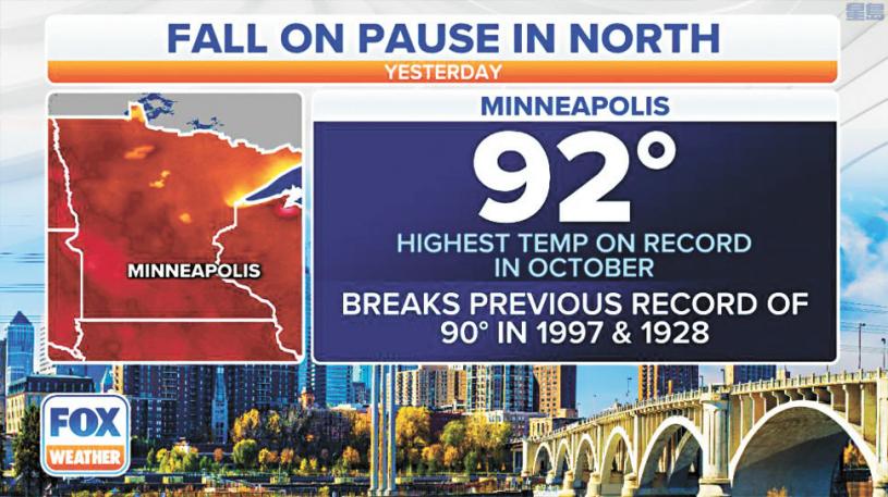 明尼蘇達雙城(Twin Cities)在1日的氣溫達到驚人的92度,創下了區內進入10月後的紀錄,即使在整個夏季期間,當地亦只有10天的氣溫高於這個數值。