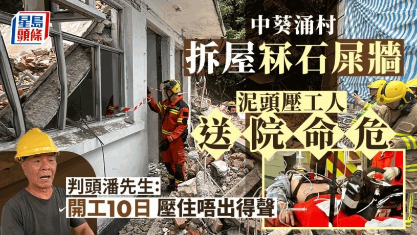 今(8日)早上9時22分,中葵涌村近傅屋路一間村屋,當時工人正在進行拆卸工程,其中姓張(62歲)工人獨自在一樓用燒焊工具切斷上層的地板鋼筋,其間一幅10呎乘8呎、厚6吋的石屎牆突倒冧,張的下半身被石屎泥頭壓住,工友聽到巨響發現報警求助。救護員到場將昏迷傷者送仁濟醫院,其後轉送瑪嘉烈醫院搶救,現時情況危殆。
